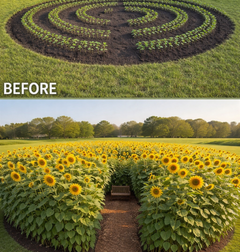 By mid-season, the plants become dense enough to create a visible wall around the planted circle. Later, bright yellow sunflower heads bloom above the walls, turning the garden space into a stunning natural sanctuary.